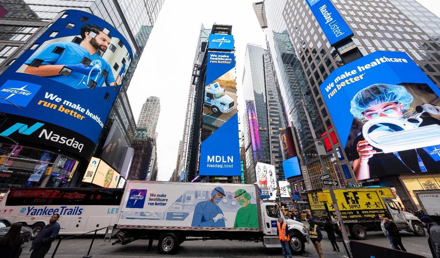 Well before the Nasdaq opening bell on Dec. 17, Medline’s listing day began with a MedTrans truck threading its way through crowded Manhattan streets. At the wheel was Joe Ruiz, navigating toward Times Square, where his truck, bearing Medline logos and a smiley-face sign he affixed himself, would help mark one of the biggest milestones in the company’s history.