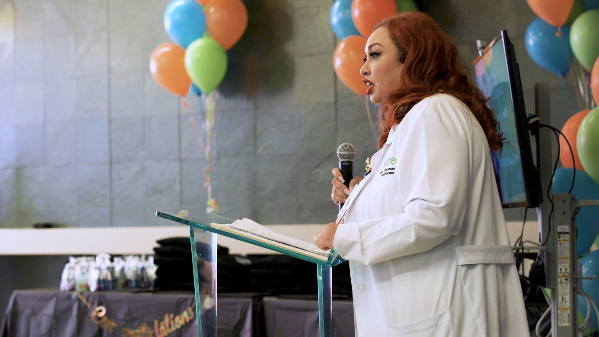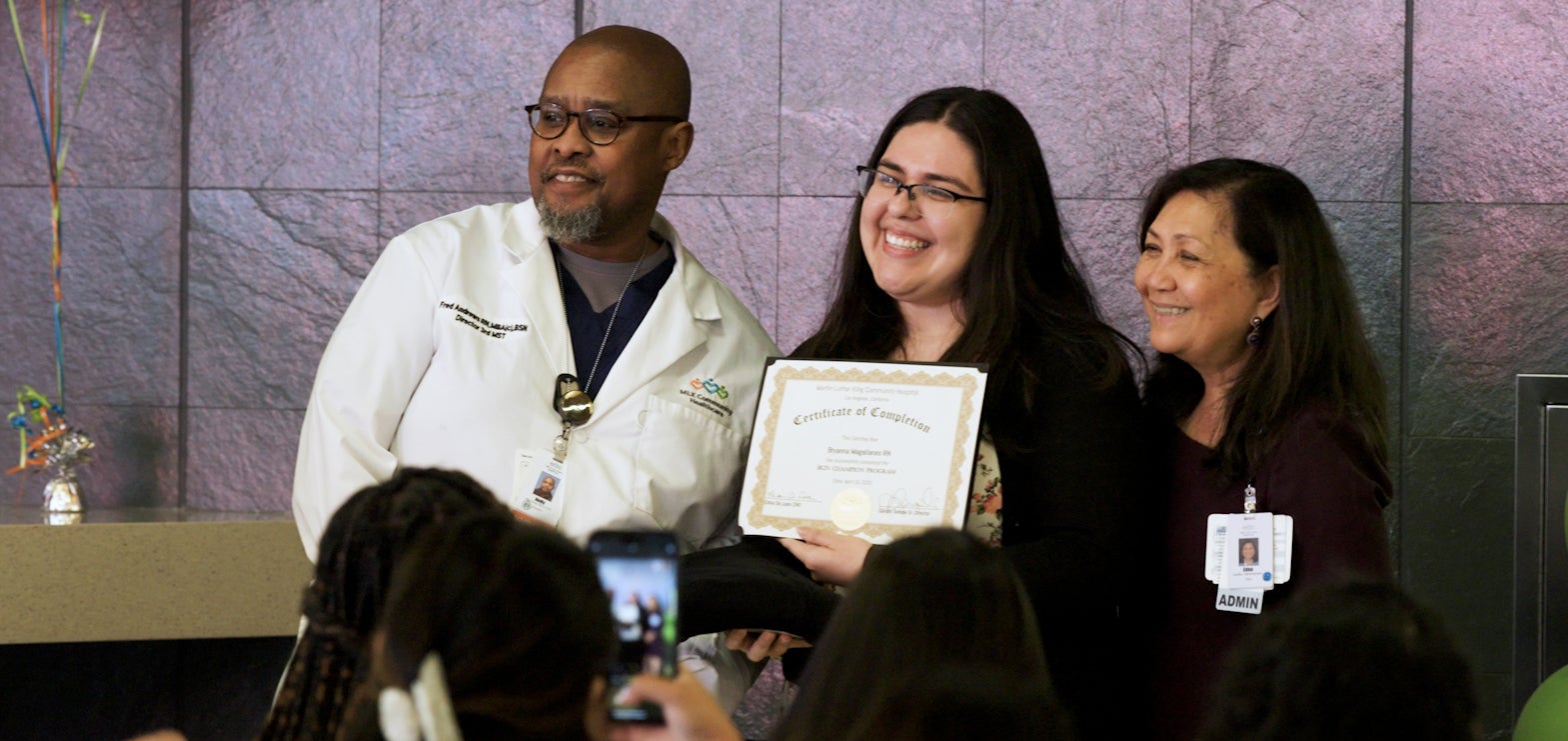 Narvaez and Sandra Temple, MLKCH’s senior director of nursing operations, skipped the formality of caps and gowns in their planning, but they and MLKCH arranged for just about everything else: printed invitations for the graduates and leaders across the organization, a stage for each nurse to walk across as their name was announced and certificates signed by Temple and chief nursing officer Edna De Leon, along with thank-you letters and Skin Champion sweatshirts and badges to make the graduates instantly recognizable in the hospital’s hallways. Family and friends filled the audience.