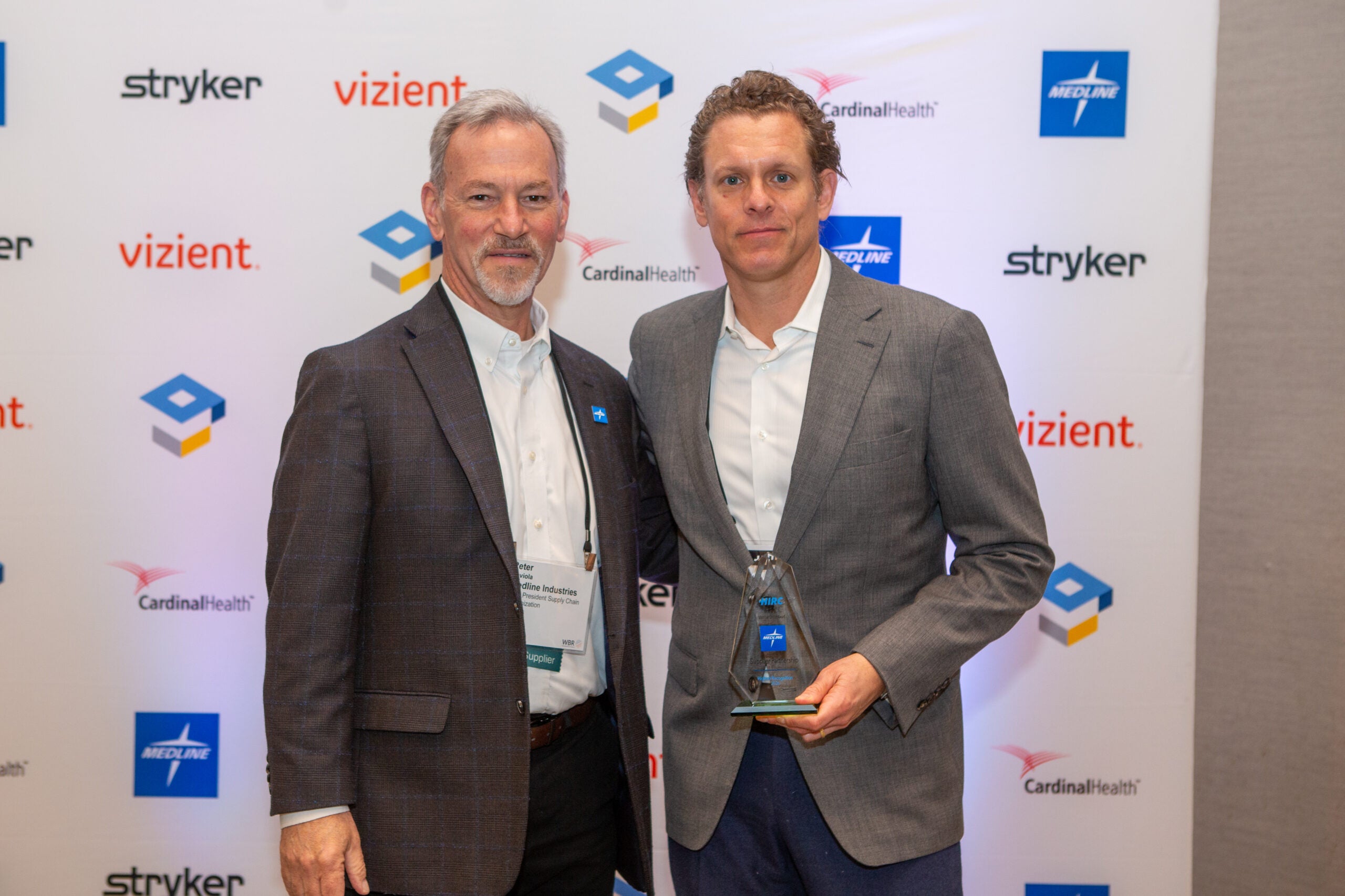 Peter Saviola (left), Medline vice president, national field sales, and Marc Phillips, Medline senior vice president, supply chain solutions, pose with the HIRC Highest Member Choice Award for Supplier Partnership.