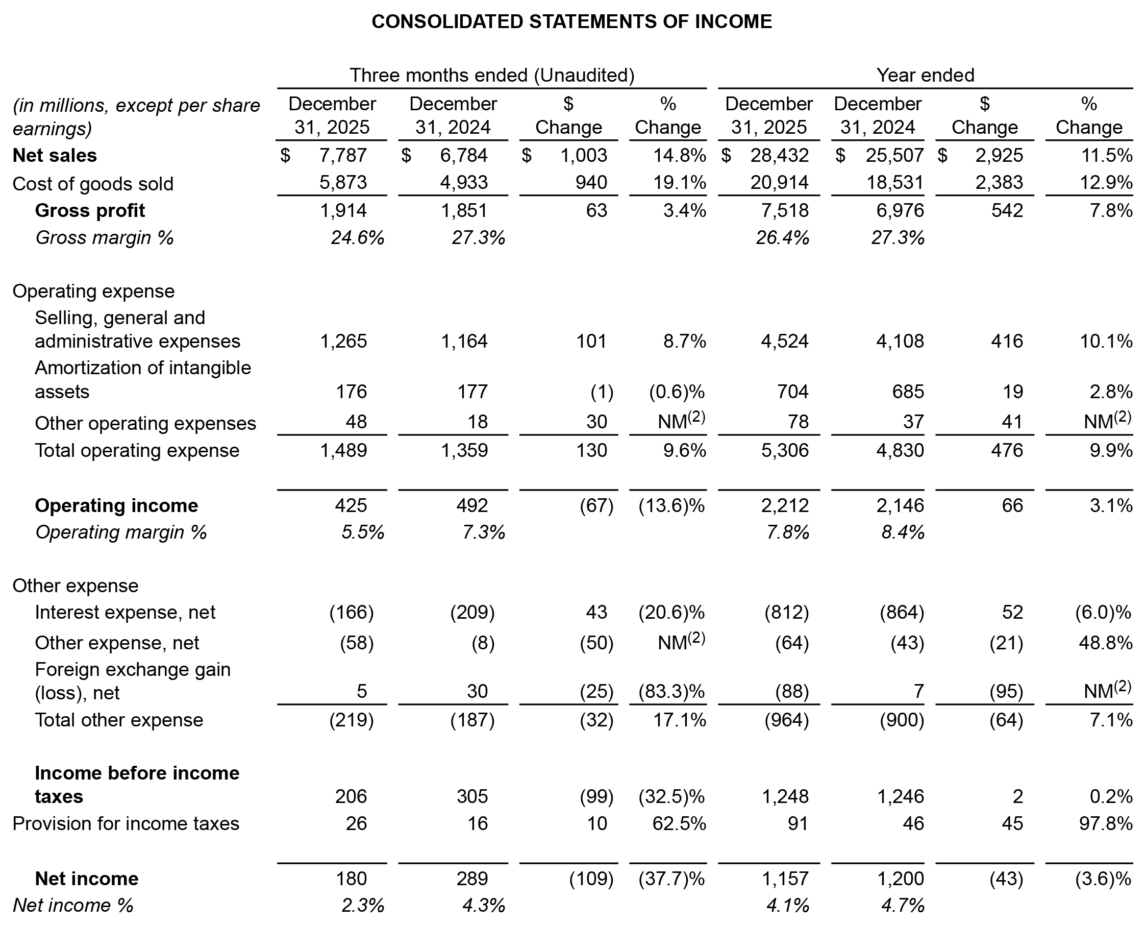 Full year 2025 net income was $1.2 billion, a decrease of 3.6% compared to $1.2 billion for full year 2024, driven by higher costs of goods sold due to tariffs and higher operating costs, including investments in headcount and IPO‑related expenses, partially offset by higher net sales.