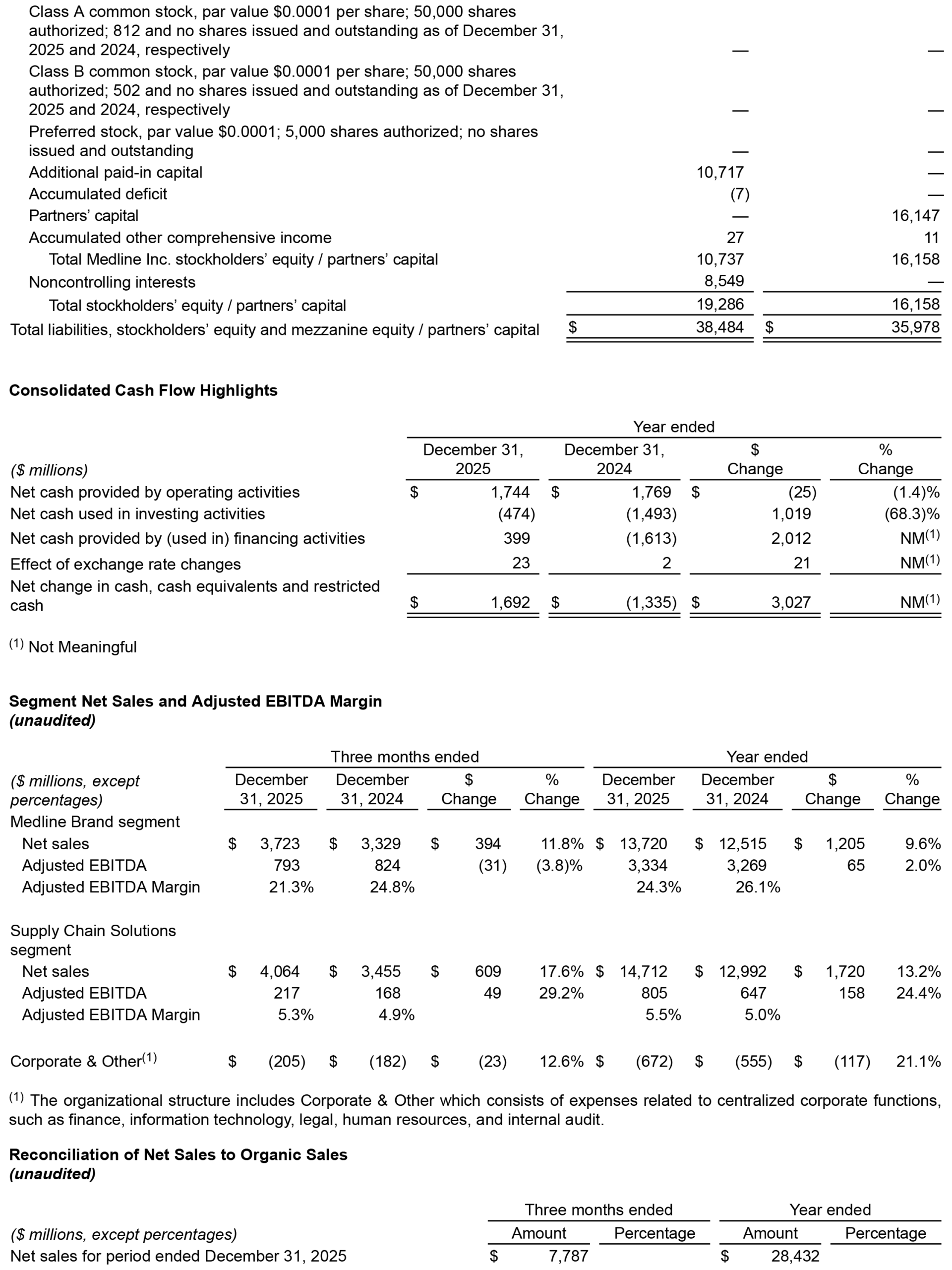 Net sales in the fourth quarter 2025 were $7.8 billion, an increase of 14.8%, compared to $6.8 billion in the fourth quarter 2024, with Organic Sales¹ increasing 14.4%. This was primarily driven by increased volumes, with strong growth from both the Medline Brand and Supply Chain Solutions segments.