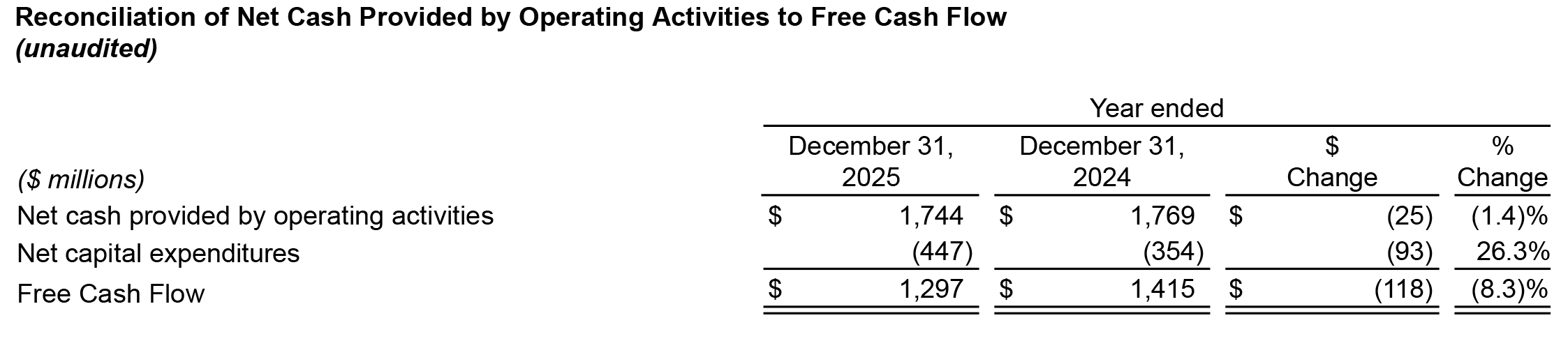 Net cash provided by operating activities for the full year of 2025 was $1.7 billion, primarily driven by net income, excluding the impact of non-cash items, partially offset by changes in working capital primarily due to increased trade accounts receivable related to net sales growth, increased inventories including tariff impacts, and a net cash outflow in the second quarter of 2025 related to legal settlements.