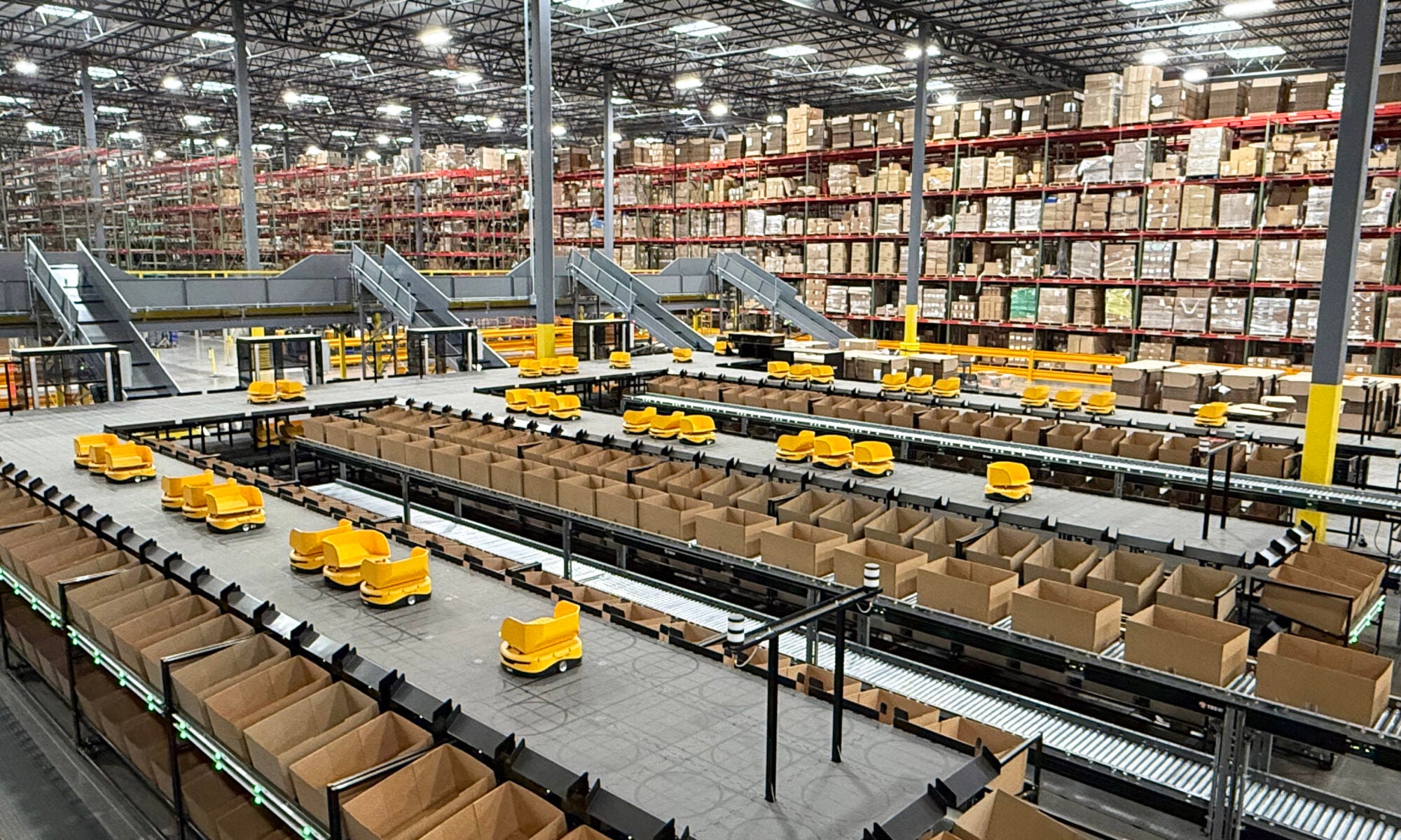 Here’s how it works: Instead of robots bringing the products to employees to pack orders (which is how Medline’s celebrated AutoStore technology from Swisslog works), Pick Pack Pro first uses Medline-developed technology to batch up to 1,100 health-plan orders together at once. Items from the curated product catalogs are placed on “tSort” robots from Tompkins, which automatically sort and route the correct number of those items to the boxes of individual orders. Once a box has everything for the order, the contents are prepared for shipping. Automated technology from Ranpak senses the amount of space the products take up, cuts and folds the box accordingly and seals it without the need for plastic filler material. A conveyor system by Trew then prints a shipping label and information about order contents, applies this to the box and routes it to the correct truck for shipping.
